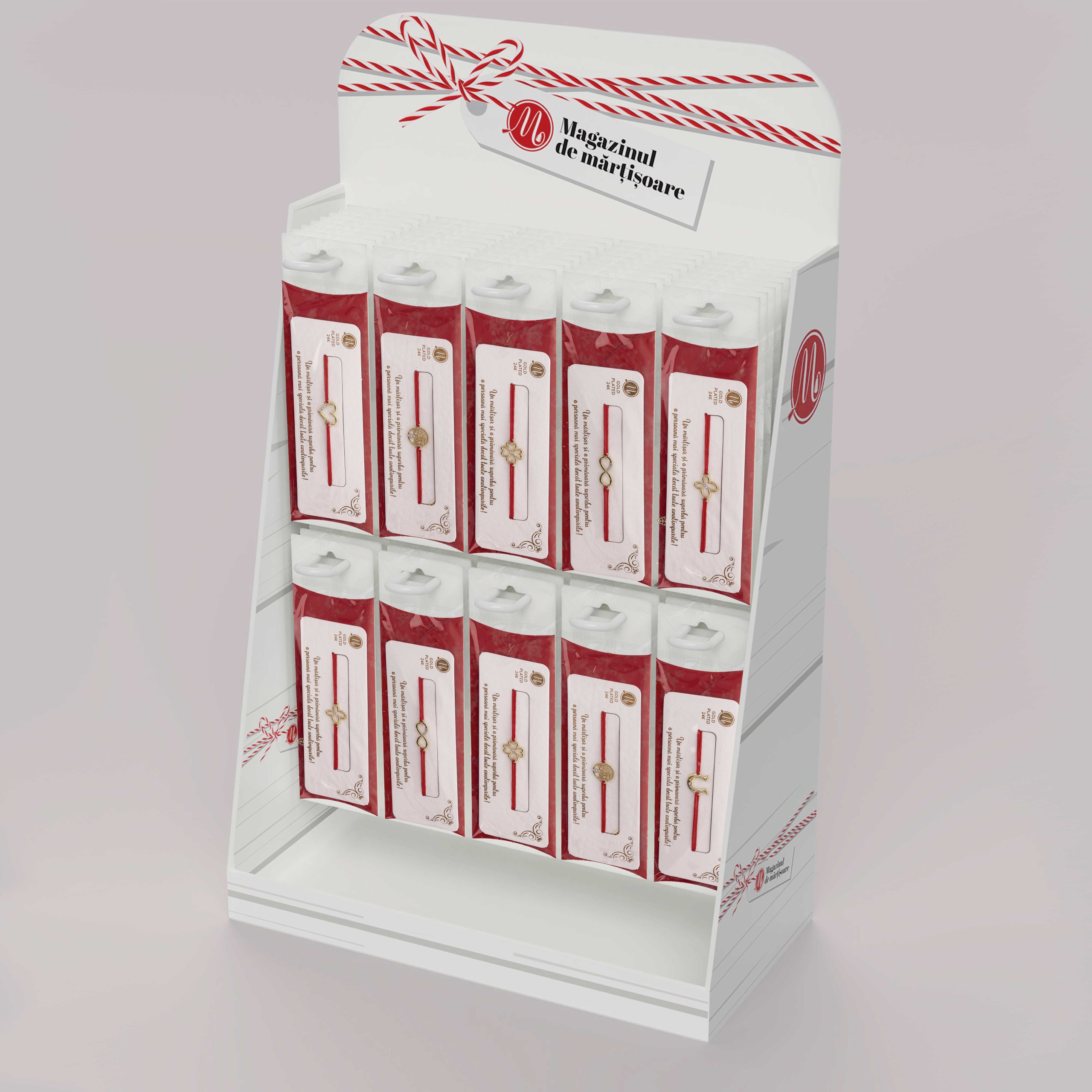 Display cu 120 brățări gold plated, șnur roșu, modele variate, ambalate individual pe suport de brățară, plic și punguță OPP.