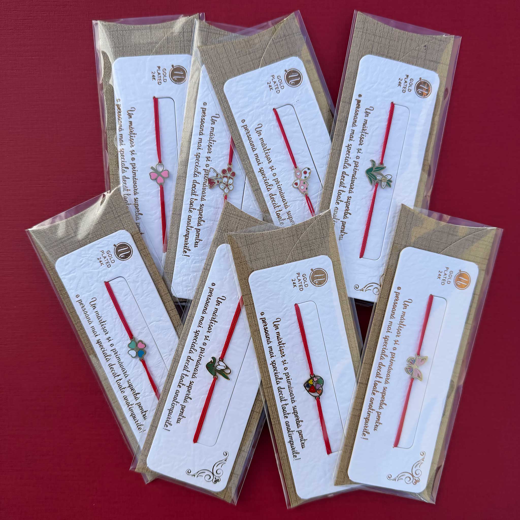 Display cu 120 brățări gold plated, șnur roșu, modele variate, ambalate individual pe suport de brățară, plic și punguță OPP.
