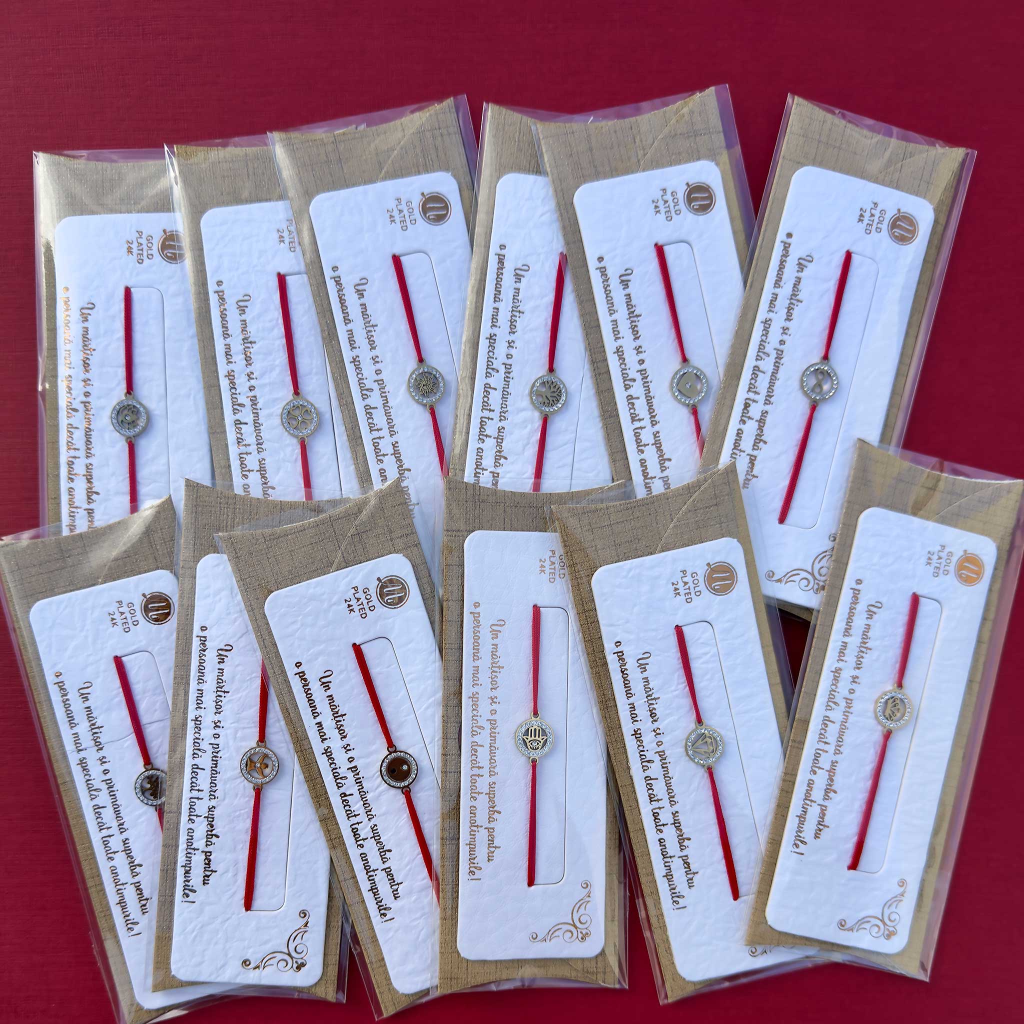 Display cu 120 brățări gold plated, șnur roșu, modele variate, ambalate individual pe suport de brățară, plic și punguță OPP.