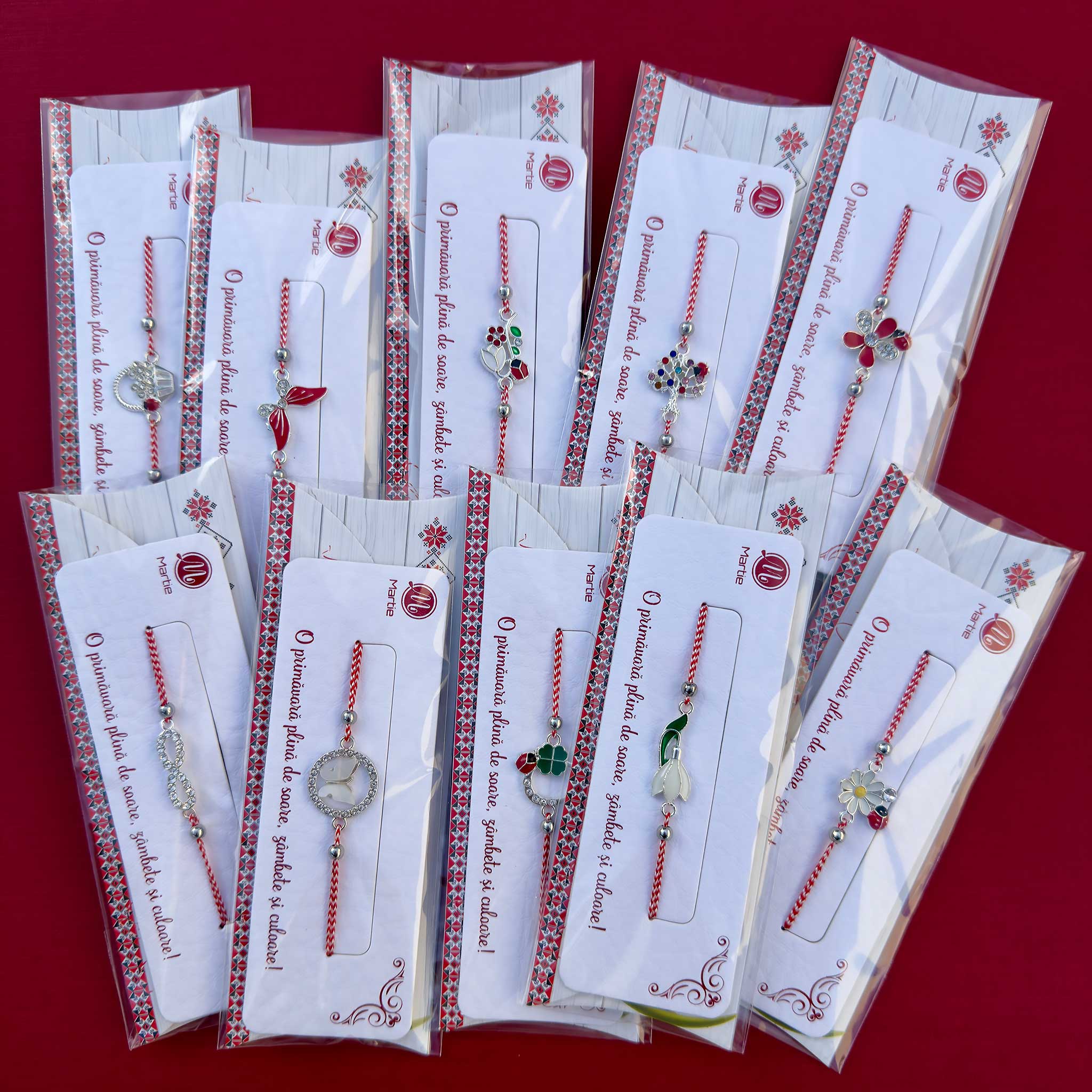 Display cu 120 brățări, șnur alb-roșu, modele variate, ambalate individual pe suport de brățară, plic și punguță OPP.