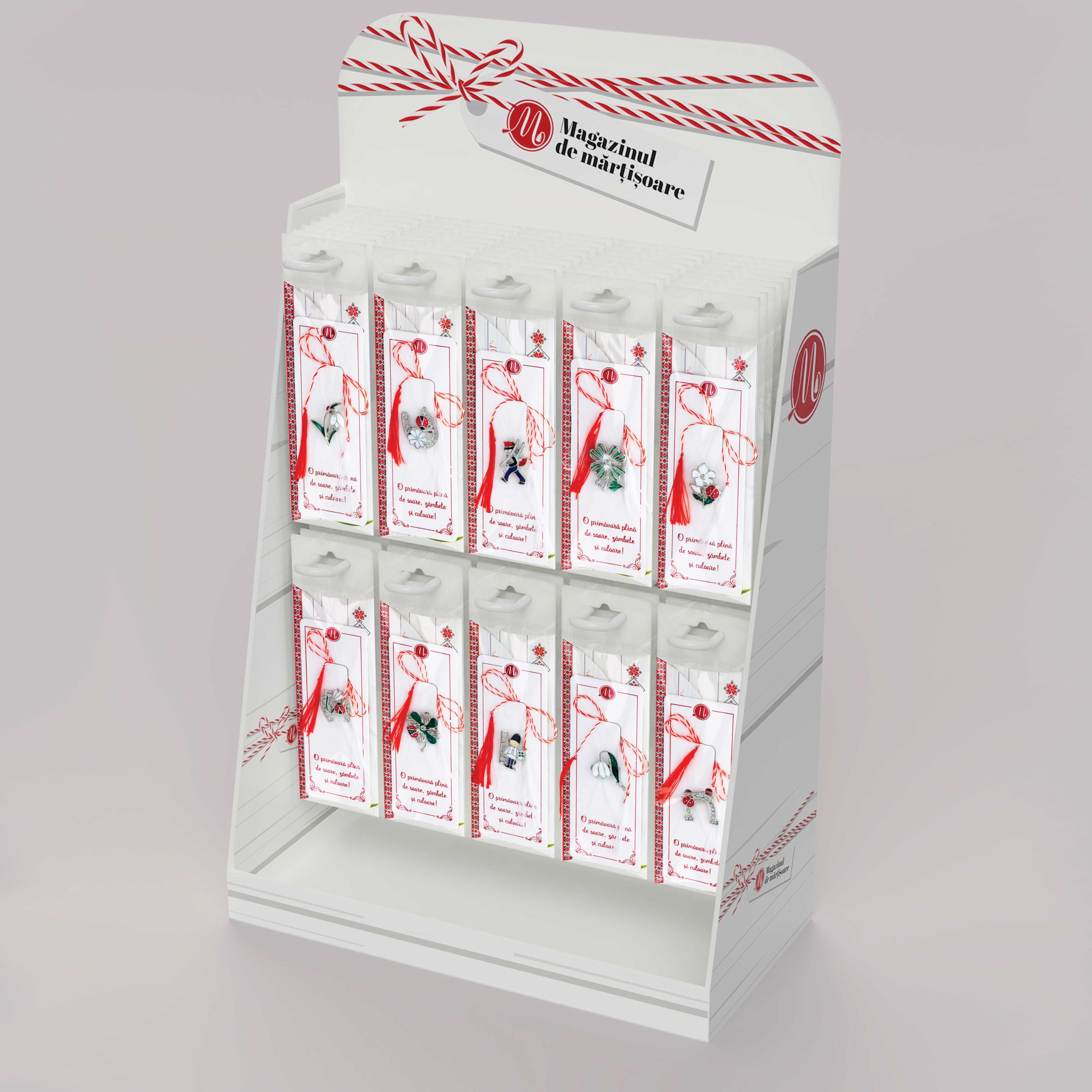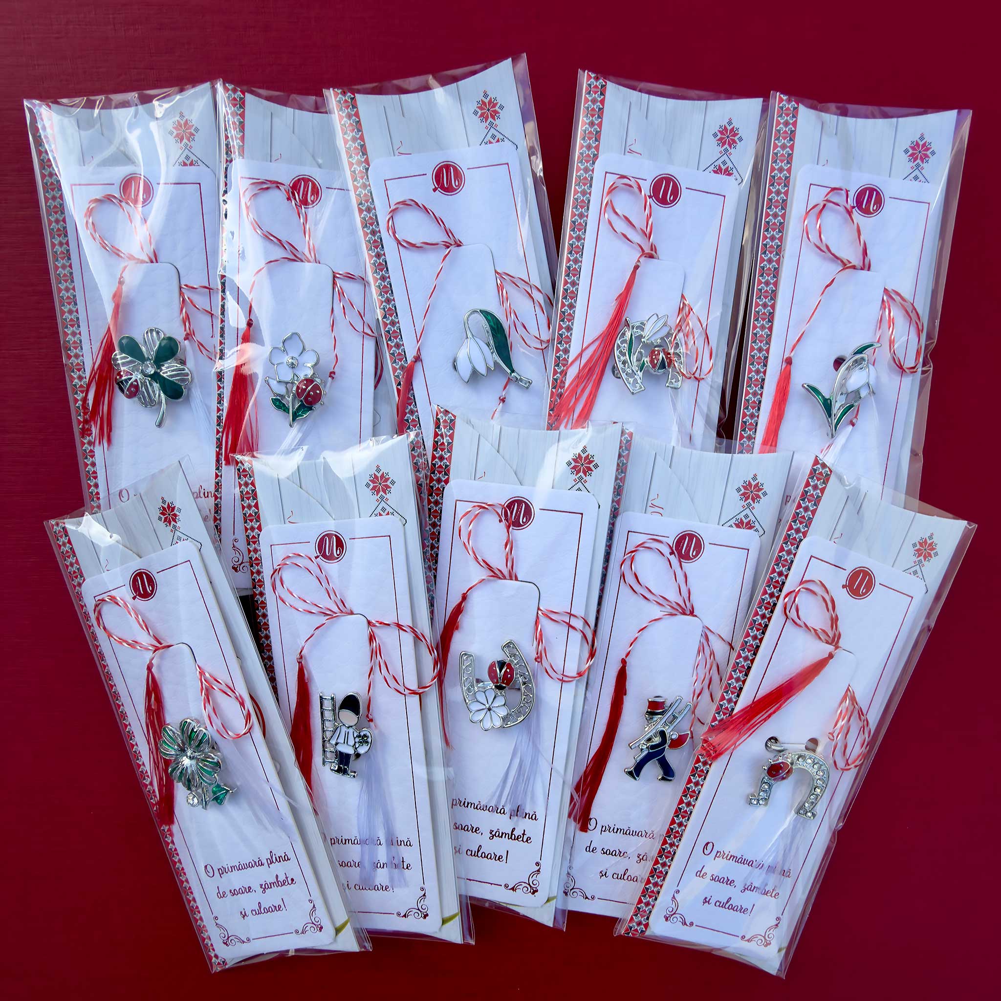 Display cu 120 broșe, modele variate, ambalate individual pe suport de broșă, plic și punguță OPP.