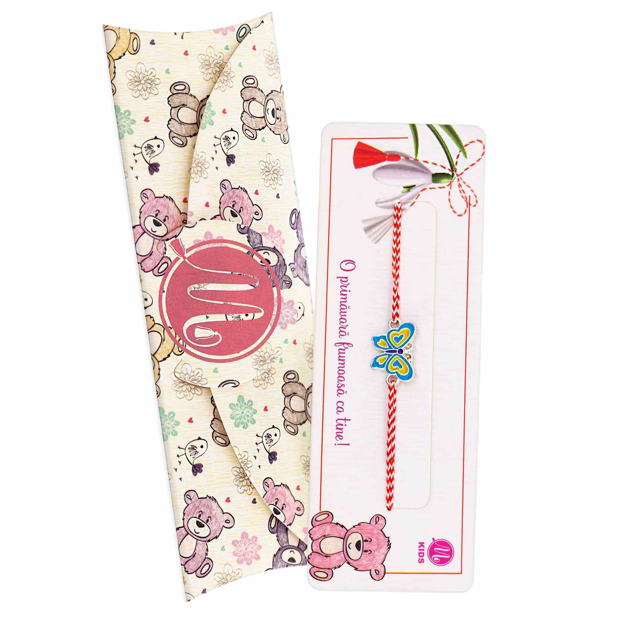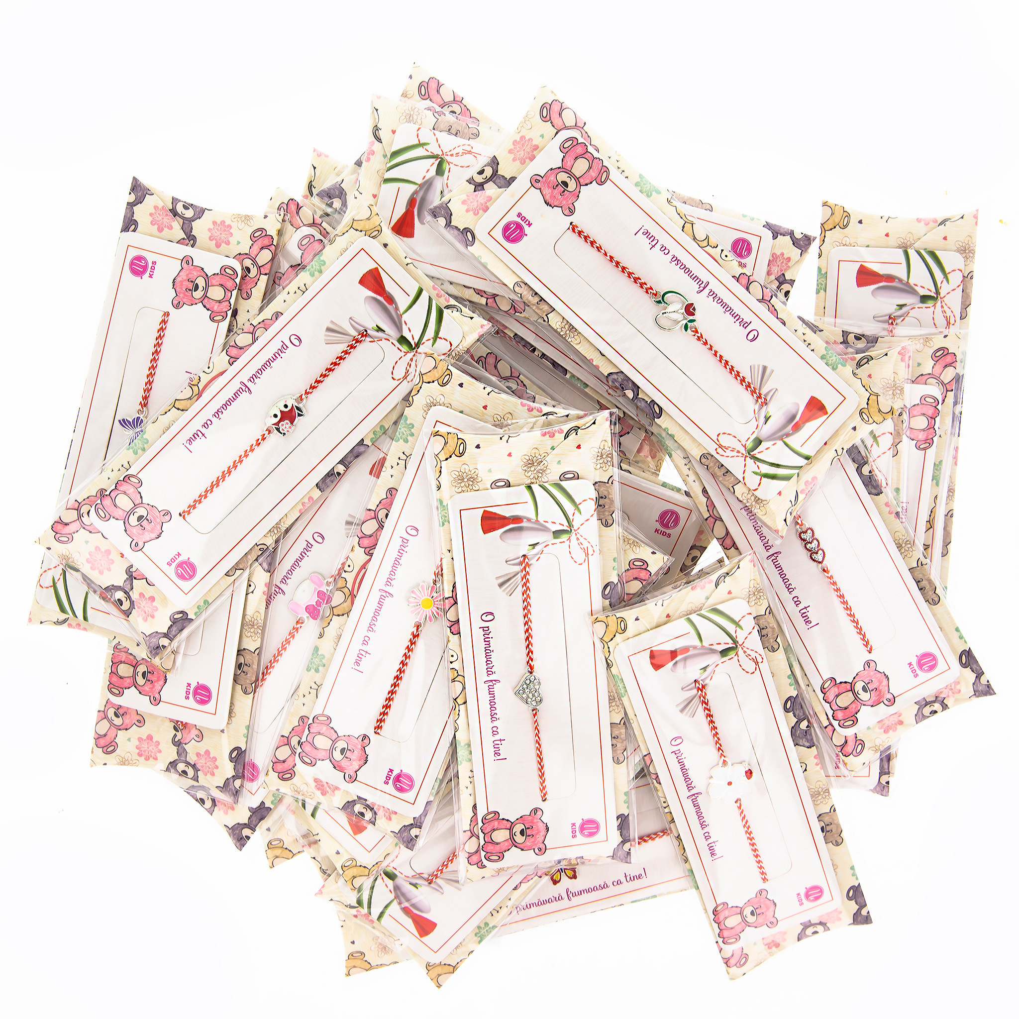 Set compus din 150 brățări cu șnur alb-roșu, modele variate (fluturaș, floricică, inimioară, trifoi, etc) ambalate individual pe suport de brățară, plic și punguță OPP.