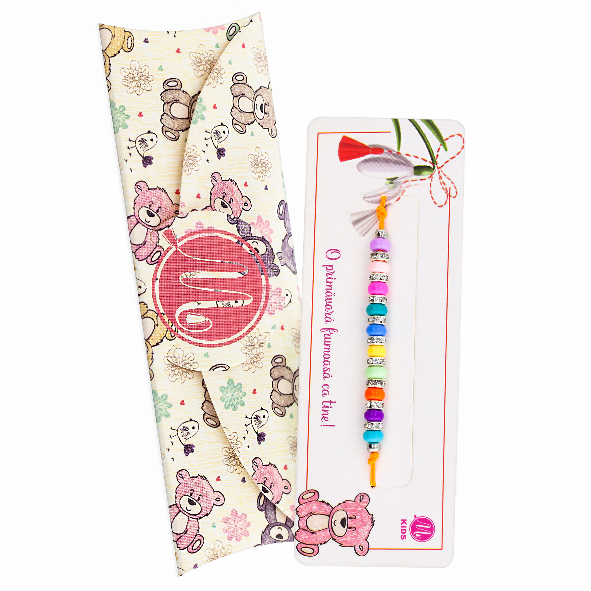 Set compus din 150 brățări cu biluțe colorate și șnur de diferite culori (verde, roșu, portocaliu, roz, multicolor, etc) ambalate individual pe suport de brățară, plic și punguță OPP.